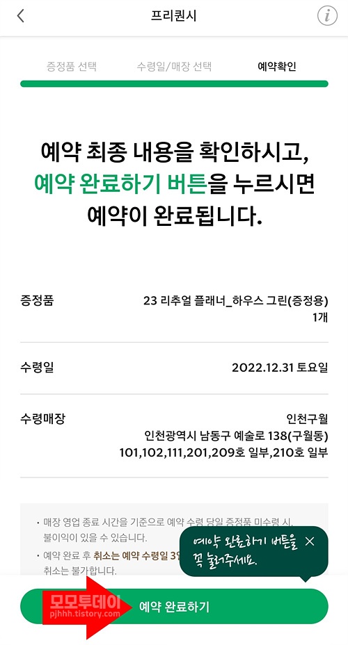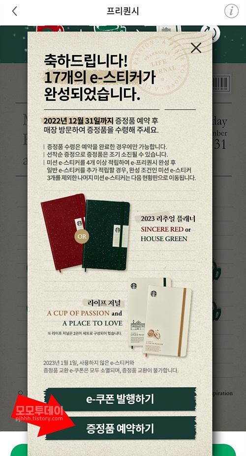 프리퀀시 스티커가 다 모이면 '축하드립니다!' 하는 창이 뜨는데요. 여기서 하단 [증정품 예약하기]를 누른 뒤, 다음 화면 하단에서 [예약하기]를 누릅니다.