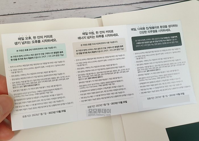 오후 2시 이후, 오전 11시 이전에 사용할 수 있는 쿠폰과 다회용 컵, 텀블러에 사용할 수 있는 1+1 쿠폰이 총 3장 들어있습니다.