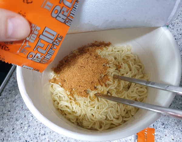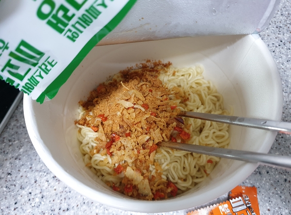 일단 면을 용기에 써있는대로 끓는 물에 2분 30초 동안 익힌 다음 물을 다 버리고 스프를 넣었습니다. 그런데 어디서 익숙한 향기가.. 스프에서 라면스프 향이 살짝 나더라구요 ㅎㅎ