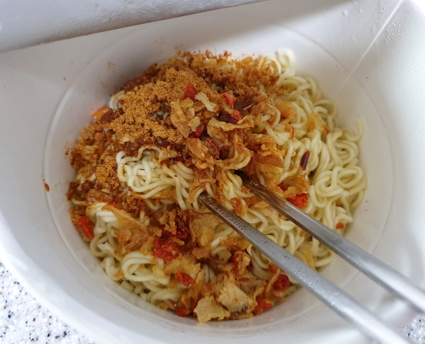 조리방법은 일반 라면과 크게 다를 것 없이 간단했습니다. 면만 먼저 익힌 다음에, 물을 다 버리고 스프, 조미유, 후레이크를 넣어서 비벼 먹는 방법이었어요.
