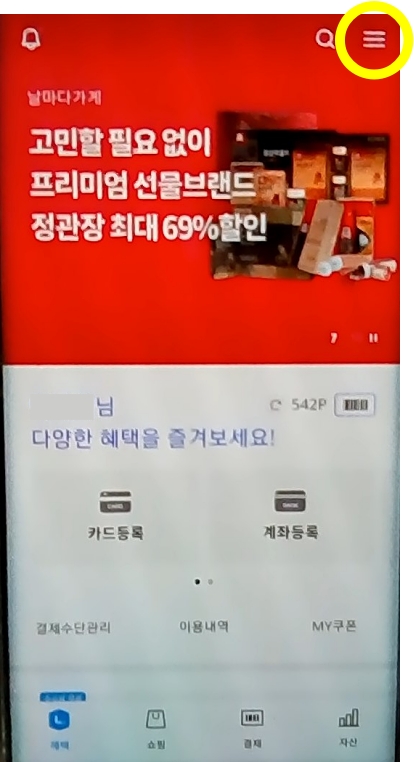 먼저 롯데 '엘포인트' 앱에 들어간 뒤, 엘포인트 앱 메인화면 상단 오른쪽에서 전체 메뉴 버튼을 누릅니다. 전체 메뉴가 나오면 페이지 중간쯤 '포인트·결제'부분에서 '포인트 전환'을 누릅니다.