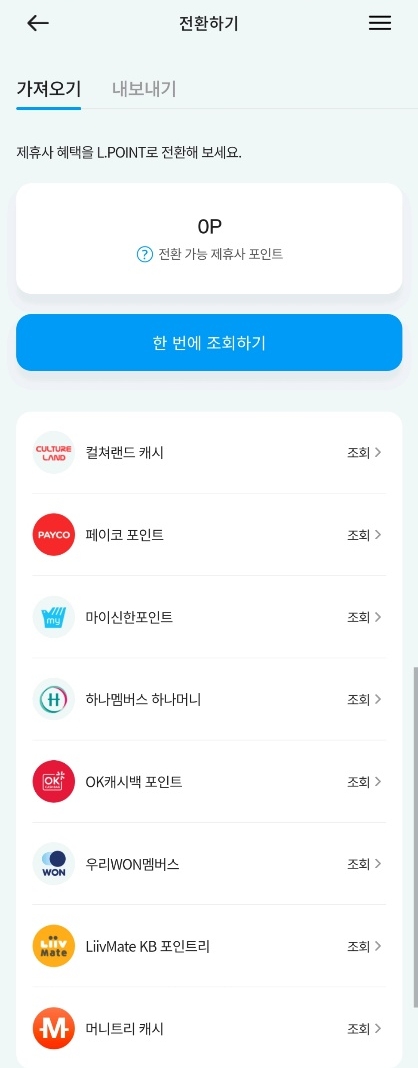 '포인트 전환'메뉴 중 '가져오기'에서는 다른 포인트를 엘포인트로 전환할 수 있는데요. 컬쳐랜드 캐쉬와 페이코 포인트, 마이 신한 포인트, 하나 멤버스 하나 머니, 그리고 ok캐쉬백 포인트, 우리 멤버스, kb 포인트리 등의 포인트를 엘포인트로 전환할 수 있습니다.