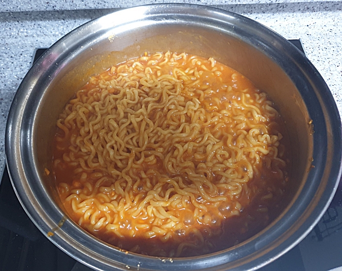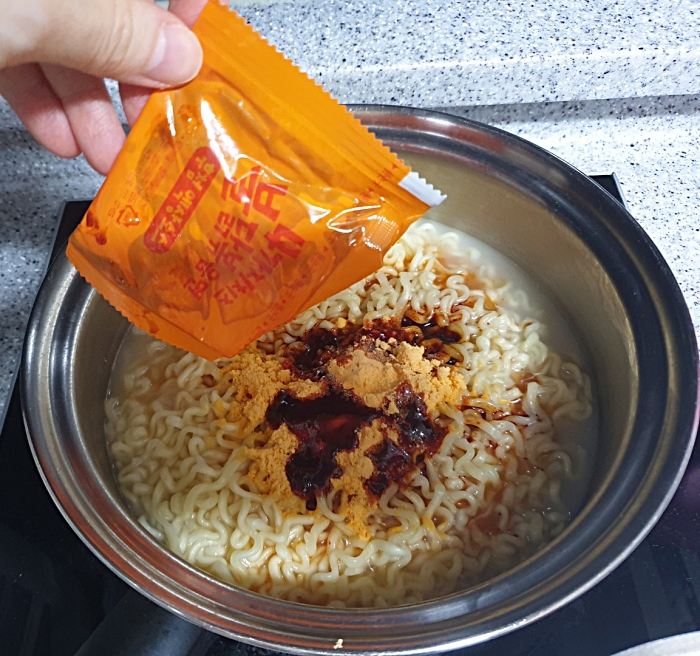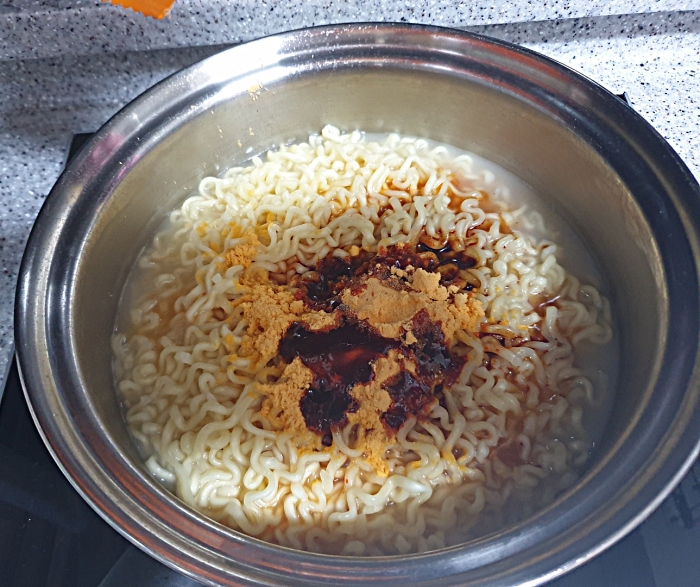 면을 끓인 다음 물을 어느 정도 버리고 치즈분말과 불닭소스 투하!