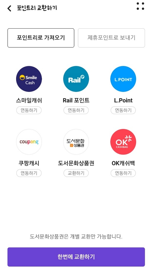 '포인트리로 가져오기'에서는 다른 포인트를 kb 포인트리로 전환할 수 있습니다. 스마일 캐쉬, 롯데 엘포인트, 쿠팡 캐시, 북앤라이프 도서 문화 상품권, ok 캐쉬백 등이 kb 국민은행 포인트리로 교환 가능합니다.