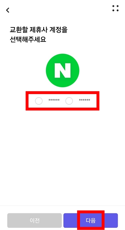 다음 페이지에서 네이버 계정을 선택하고 하단에 '다음'버튼을 누릅니다. 그러면 네이버 페이로 전환할 수 있는 포인트리가 상단에 조회되는데요.