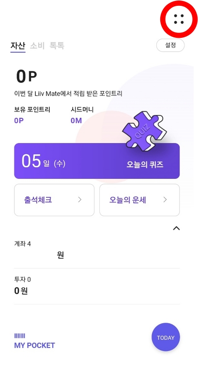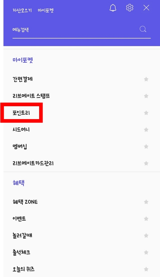 먼저 리브메이트 어플에 들어간 뒤, 메인화면 상단 오른쪽에서 전체 메뉴 버튼을 누릅니다. 전체 메뉴가 나오면 스크롤을 쭉 내려서 '마이포켓' 하위 메뉴 중 '포인트리'에 들어갑니다.