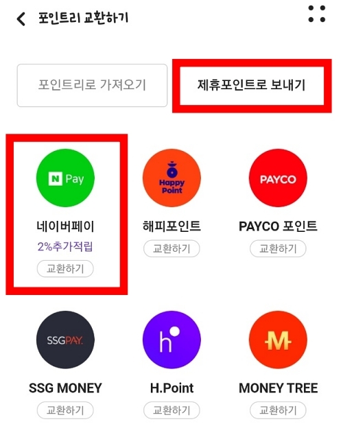 '제휴포인트로 보내기'에서는 포인트리를 다른 포인트로 전환할 수 있는데요. 네이버 페이와 해피 포인트, 페이코 포인트, ssg 머니, 현대 h포인트, 그리고 롯데 l포인트와 대한항공 스카이 패스 마일리지, 아시아나항공 마일리지 등 kb 포인트리를 여러 제휴사 포인트로 전환할 수 있습니다.