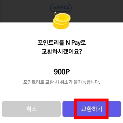'교환하기'버튼을 누르면 '포인트리를 n pay로 교환하시겠어요?' 하는 메세지가 뜨는데요. 여기서 '교환하기'를 누른 뒤 비밀번호를 입력하면 kb 포인트리가 바로 네이버 페이 포인트로 교환됩니다.