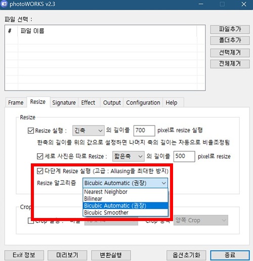 그리고 마지막 '다단계 리사이즈 실행' 옵션이 바로 화질에 많은 영향을 주는 부분입니다.