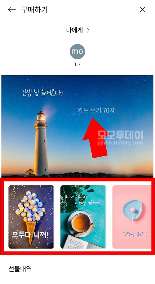 기본적으로 기프트콘의 개념인 만큼 본인에게 할인쿠폰을 선물하는 느낌으로 기프트콘이 발송됩니다~ 본인에게 보내는 쿠폰이지만 카드도 쓸 수 있어요 ㅎㅎ 카드 배경은 하단에서 고를 수 있습니다~