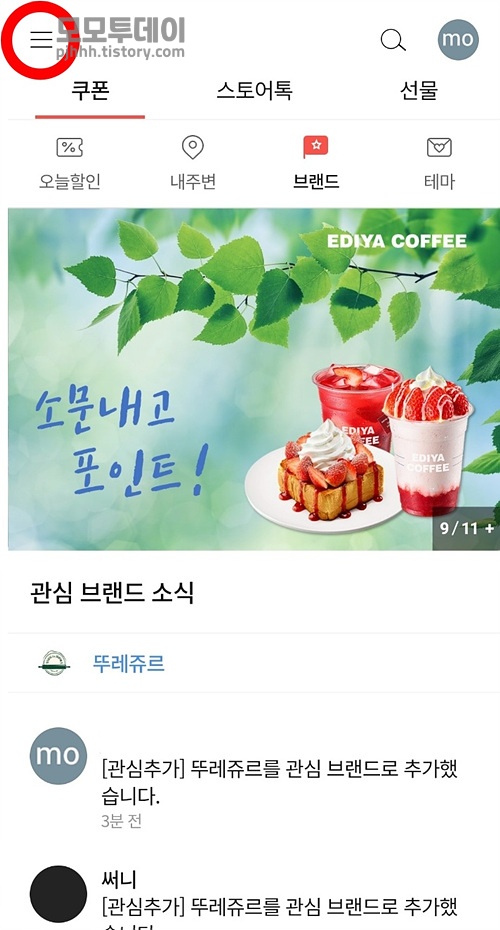 쿠폰은 일상 카페 메인화면 상단에서 직접 검색하거나, 메인화면 상단 왼쪽 [쿠폰] 메뉴에서 [브랜드]를 누르고 스크롤을 내려서 브랜드를 선택할 수도 있습니다.