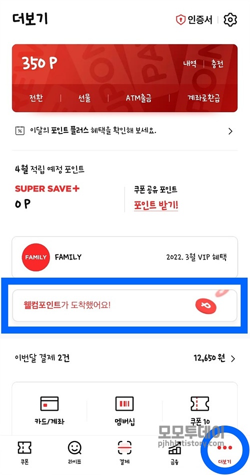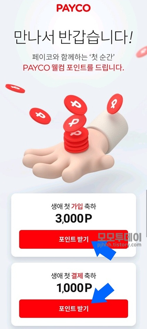 가입 축하 포인트와 첫 결제 후에 지급되는 축하 포인트는 페이코 앱 하단 메뉴 [더보기]에서 페이지 가운데 [웰컴 포인트가 도착했어요]를 누르고, 다음 페이지에서 해당 포인트 아래 [포인트 받기]를 누르면 지급됩니다.