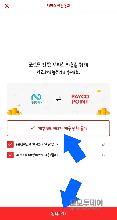 다음 페이지에서 [개인 정보 제3자 제공 전체 동의]를 누른 다음 하단에서 [동의하기]를 누르면 포인트 전환 페이지가 나오는데요~