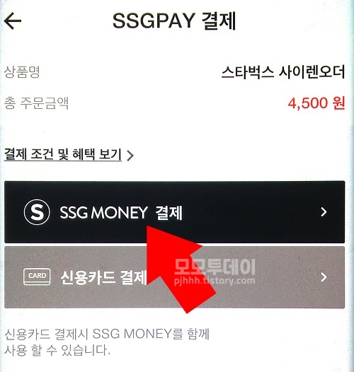 ssg머니로 전환이 완료되면 스타벅스 앱 사이렌 오더에서 주문할 메뉴를 선택합니다. 그리고 마지막 '결제하기'페이지 상단에서 '결제 수단'을 'ssg 페이'로 선택한 뒤 하단에서 [ooo원 결제하기]를 누릅니다.