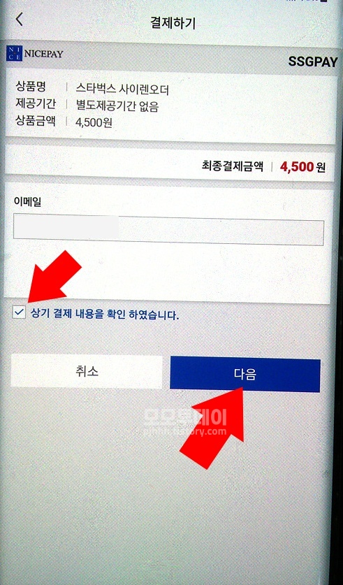 'ooo점으로 주문하시겠어요?'하는 페이지가 나오면 하단 오른쪽에서 [결제 및 주문하기]를 누른 뒤, 다음 페이지 결제 화면에서 약관에 동의하고, '상기 결제 내용을 확인하였습니다'에 체크한 다음 하단 오른쪽에서 [다음]을 누릅니다.